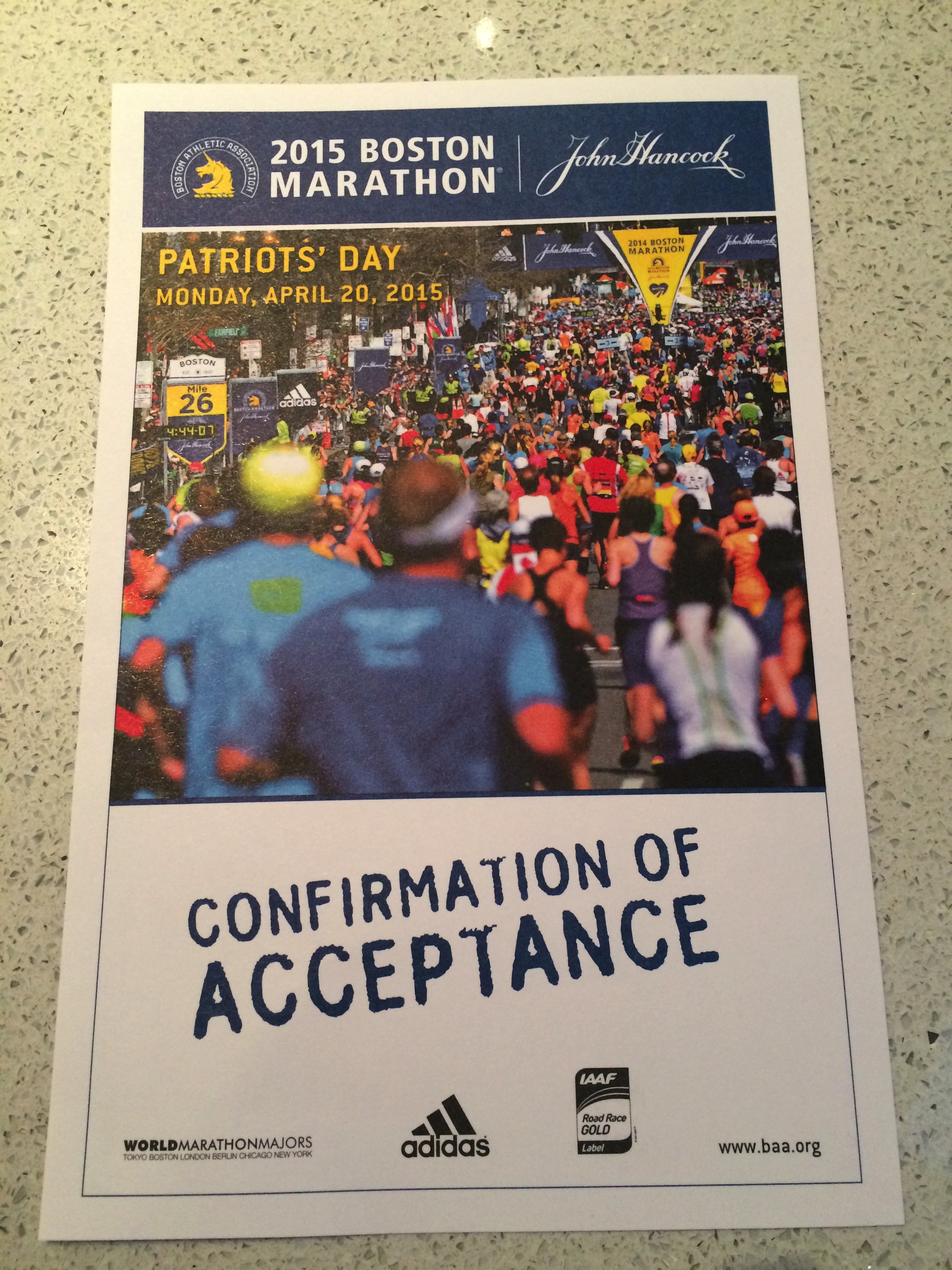 Thirdly, and the most amazing part of my day, just got home to my confirmation of acceptance letter form the 2015 Boston Marathon :))))) I knew I was in but there is just something so nice about holding the letter in my hand and reading it with a big smile on my face!!! At the moment all runs lead to Boston…. this is what my training is all about.